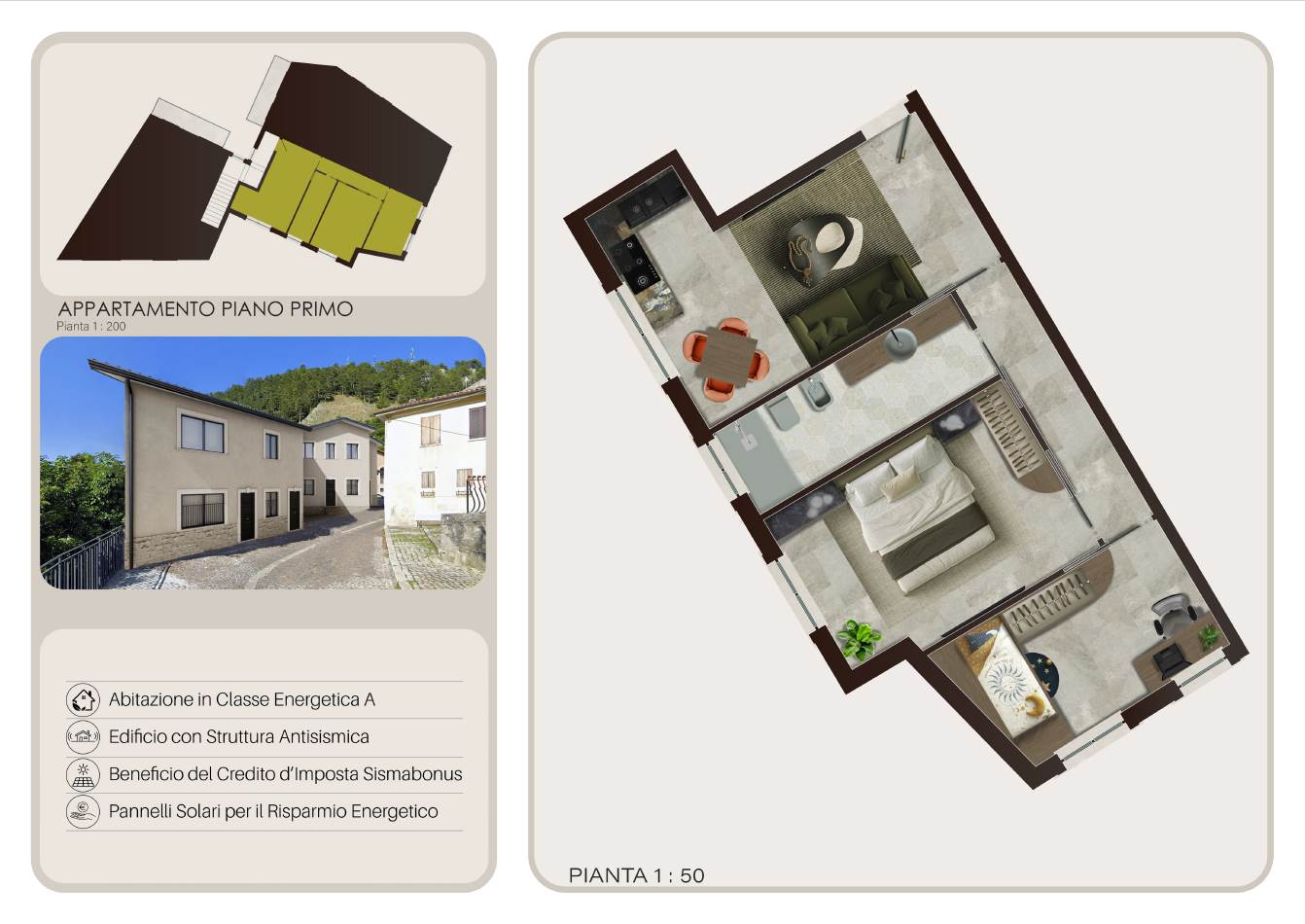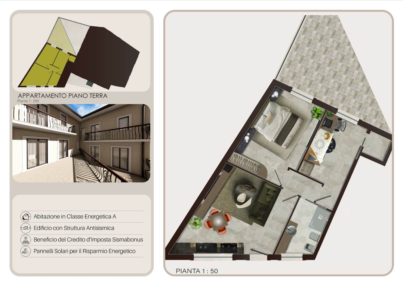 A Castel di Sangro, nella posizione più alta del centro storico e comodamente raggiungibile in macchina, proponiamo in vendita appartamenti di prossima realizzazione. Nello specifico si tratta di sei trilocali. Tutti gli appartamenti si compongono di zona giorno con angolo cottura, due camere da letto e un bagno. Due unità abitative del piano terra sono corredate da terrazzo, due, al primo piano, da balconi, due sono prive di spazio esterno. L'immobile, nella sua interezza, sarà realizzato per ottenere il massimo efficientamento energetico, grazie a materiali di ultima generazione. Tutti gli appartamenti potranno usufruire del credito di imposta, come previsto dalle ultime normative vigenti applicabili.
